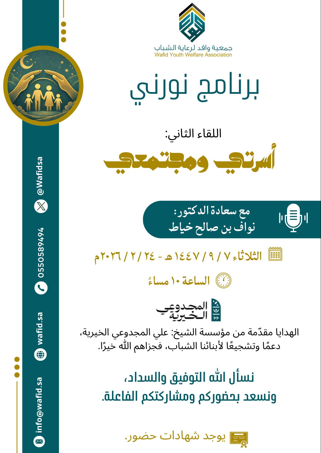 ⤵️ تقدم لكم: جمعية وافد لرعاية الشباب بمكة المكرمة 💡 برنامج: 《نورني》 🎙️ اللقاء الثاني: أسرتي ومجتمعي يقدمه سعادة الدكتور: نواف بن صالح خياط -وفقه الله- 📆 يوم الثلاثاء. 🗓️ بتاريخ 1447/9/7 الموافق 2026/2/24 ⏳ من الساعة 10م إلى الساعة 11م 🎥 عبر البث المباشر، على حساب الجمعية في اليوتيوب: https://youtube.com/@wafid.24?si=EJWdnd1SDSnT5u0o نرجوا الاشتراك في القناة وتفعيل الجرس. 📜 شهادات لجميع الحاضرين لكل لقاء. 💸 هدايا في كل لقاء (3 بطائق شحن بقيمة 300 ريال). 💰 مبالغ مالية توزع في الحفل الختامي بعد نهاية البرنامج. 📱 للاستفسار: 0550589494