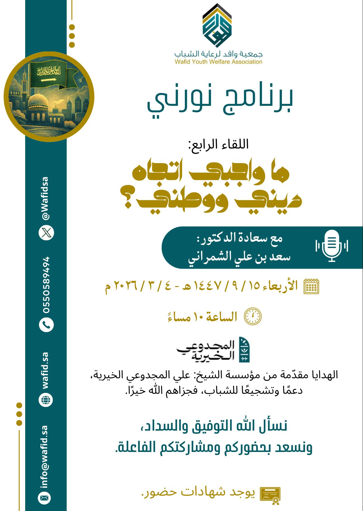 ⤵️ تقدم لكم: جمعية وافد لرعاية الشباب بمكة المكرمة 💡 برنامج: 《نورني》 🎙️ اللقاء الرابع: ما واجبي اتجاه ديني ووطني؟ يقدمه سعادة الدكتور: سعد بن علي الشمراني -وفقه الله- 📆 يوم الأربعاء. 🗓️ بتاريخ 1447/9/15 الموافق 2026/3/4 ⏳ الساعة 10م. 🎥 عبر البث المباشر، على حساب الجمعية في اليوتيوب: https://youtube.com/@wafid.24?si=EJWdnd1SDSnT5u0o نرجوا الاشتراك في القناة وتفعيل الجرس. 📜 شهادات لجميع الحاضرين لكل لقاء. 💸 هدايا في كل لقاء (3 بطائق شحن بقيمة 300 ريال). 💰 مبالغ مالية توزع في الحفل الختامي بعد نهاية البرنامج. 📱 للاستفسار: 0550589494